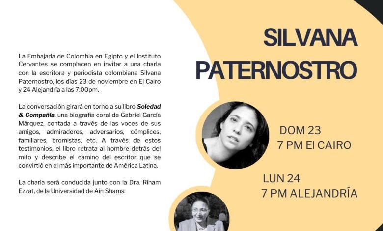 ينظم معهد ثربانتس بالقاهرة، بالتعاون مع سفارة كولومبيا في مصر، لقاءً بعنوان «العزلة والصحبة. رؤية جديدة لجابرييل جارسيا ماركيز» اليوم الأحد 23 نوفمبر 2025 بمقر المعهد بالدقي في القاهرة، وغدًا الإثنين 24 نوفمبر بمقر المعهد بالإسكندرية. تبدأ الجلستان في تمام الساعة السابعة مساءً. ينعقد اللقاءان باللغة الإسبانية، والدخول مجاني حتى اكتمال العدد.