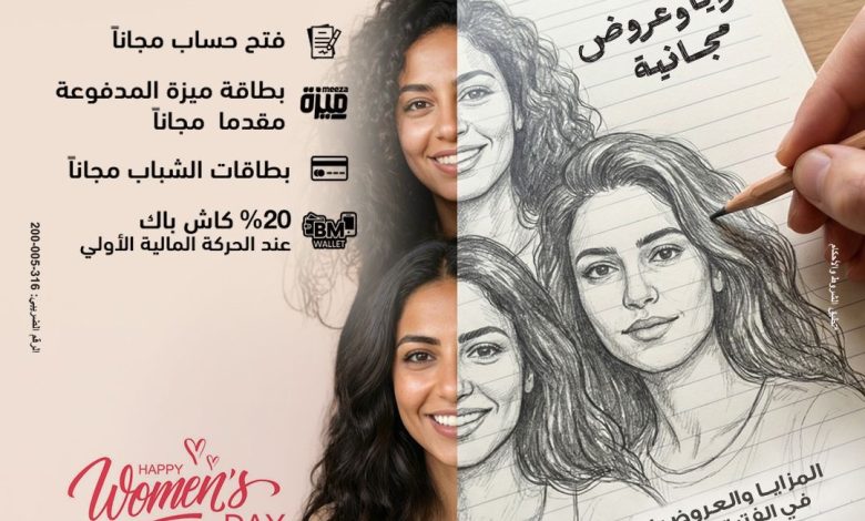 هذا ويحرص البنك على توفير العديد من المزايا والعروض المجانية التي تخدم كافة العملاء وبخاصة المرأة والشباب، كونهم الفئة الأكبر في المجتمع، وذلك طوال مدة الفعالية التي تمتد خلال الفترة من 8 الي 31 مارس 2026 ، ومنها فتح الحسابات الجارية والتوفير (أفراد) مع الاعفاء من المصروفات الخاصة بفتح الحساب والحد الأدنى لفتح الحساب ومصاريف الدمغة (حسابات جارى وتوفير بالجنيه المصري (نمطي وإسلامي) ، حسابات المنجز (جارى وتوفير نمطي وإسلامي) ، حسابات الشباب ،حساب توفير الممكن ،حساب جاري حوالتي جنيه مصري / دولار امريكي ، هذا بالإضافة الي إمكانية إصدار بطاقة ميزة للخصم الفوري مجانا للحسابات، وإمكانية الحصول على بطاقة ميزة المدفوعة مقدما معفاة من مصاريف الإصدار ، ويمكن للعملاء من 15 سنة إلى 21 سنة فتح الحسابات مجاناً، وإصدار بطاقة BM للخصم الفوري مجاناً ضمن برنامج الشباب، أما بالنسبة لمحفظة بنك مصر الإلكترونية BM Wallet يتم استرداد 20% من الحركة المالية الأولى، العرض متاح لمرة واحدة فقط خلال فترة الفعالية وذلك للمحفظة المفعلة ، مع تطبيق الشروط والأحكام المنظمة لذلك.